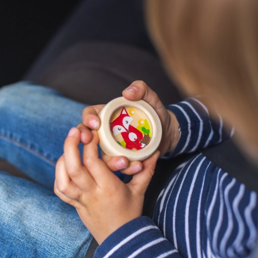 Takket være det solide træhus og det gennemsigtige låg er legetøjet både holdbart og sikkert. Det ligger perfekt i en børnehånd og passer nemt i rygsækken – oplagt til ture, i venteværelset og derhjemme.