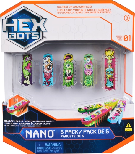 Oplev sjoven med fem HEXBOTS mikrorobotter, som takket være vibrationsteknologi bevæger sig af sig selv som ægte biller. I sættet finder du 4 klassiske Nano og 1 hurtigere Flash Nano med lyseffekter. Disse kompakte robotbiller skal blot placeres på en glat overflade og så racer de straks afsted, springer fra forhindringer og vender selv tilbage på benene. Et fremragende valg til kreativ banebygning, sanseleg og fælles sjov for både børn og forældre.