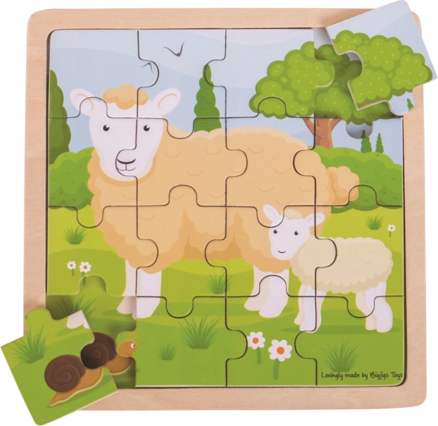 Dette træ-rammepuslespil fra BIGJIGS TOYS byder på et blidt motiv af et får med sit lam, som fanger børns interesse ved første øjekast. Brikkerne lægges direkte i rammen på en baggrund med samme motiv, så billedet ikke glider, og børnene let kan se, hvor hver brik hører til.