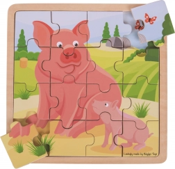 Sødt træpuslespil med motiv af en gris og en pattegris – ideelt som det første puslespil til børn fra 2 år. Indeholder 16 robuste brikker, der lægges i en ramme med samme baggrund for lettere orientering. Store brikker er nemme for børn at holde om, og lægningen styrker motorik, koncentration, fantasi og ordforråd. Fremstillet af kvalitetstræ fra ansvarlige kilder og opfylder europæiske sikkerhedsstandarder.