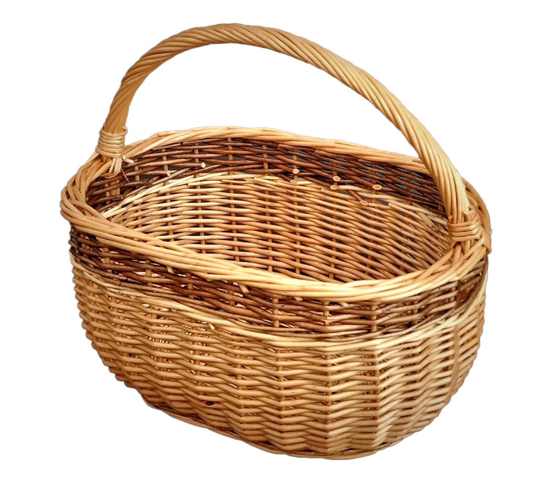 Stilfuld flettet kurv til indkøb og hjemlig brug i oval form med målene 36 × 25 × 30 cm. Takket være det solide langsgående håndtag og den kvalitetslakerede overflade er den holdbar, praktisk og ligger godt i hånden. Håndlavet udførelse giver hvert stykke et originalt udseende, og kurven egner sig også som gavekurv eller frugtkurv.