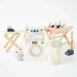 Gør børnenes tøjvask til en leg med dette smukke vaskerumssæt fra Le Toy Van. Sættet med 16 dele i FSC-certificeret træ indeholder vaskemaskine, tørrestativ, strygejern med bræt, klemmer, filtede tøjstykker, fejebakke med spand, støvsuger og flere tilbehør. Legetøjet er håndeftermalet med miljøvenlige farver, sikkert for børn og passer perfekt til Le Toy Van dukkehuse fra Daisylane-kollektionen.