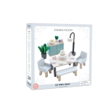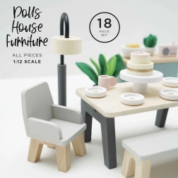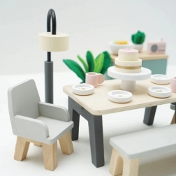 Dette charmerende spisestue sæt er lavet af højkvalitets FSC-certificeret træ og tilføjer et strejf af sofistikering til ethvert dukkehus. Indeholdt er 18 elementer, inklusive bord, to stole, bænk, lampe, skænk og dekorative accessories som planter, en skål med frugt og kage. Dette sæt ser ikke kun smukt ud, men fremmer også børns kognitive og kommunikative færdigheder. Det er dekoreret med ikke-giftige farver baseret på vand og er kompatibelt med andre Le Toy Van Dukkehuse.