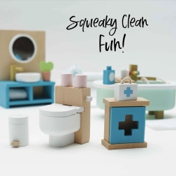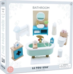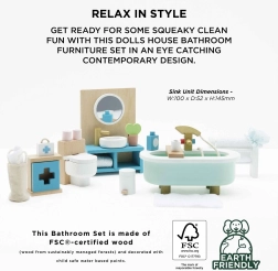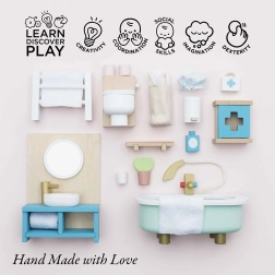 Stilfuldt sæt badeværelsesmøbler til dukkehus i skala 1:12 fra LE TOY VAN. Indeholder badekar, toilet, håndvask, håndklædeholder og medicinskab, håndmalet med giftfri vandbaseret maling. Fremstillet etisk af bæredygtige materialer, understøtter kreativ leg, kommunikationsevner og koordinering.