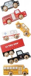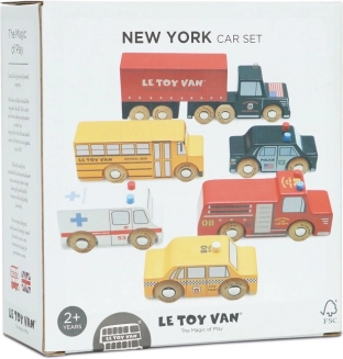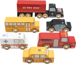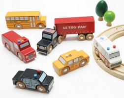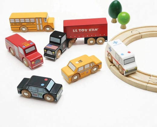 Denne farverige kollektion indeholder en leddelt lastbil med ti hjul, en gul skolebus, en politibil, en gul taxa, en ambulance og en brandbil. Omhyggelige detaljer og hjul, der ruller let, inviterer børn til åben leg, hvor de skaber historier og træner hånd–øje-koordination.
