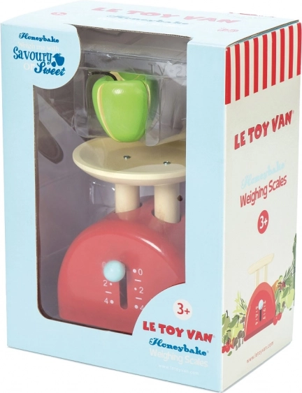 En stilfuld træ-køkkenvægt fra Honeybake-kollektionen af LE TOY VAN er det perfekte tilbehør til børnekøkkenet eller butikken. Den tilbyder realistisk vejning takket være en smart bevægelig arm, er håndmalet med ikke‑giftige vandbaserede farver, og der medfølger to delte æbler med velcro til endeløse legescenarier.