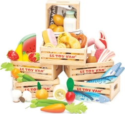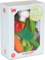 Oplev legeglæden ved købmand gennem en trækasse fyldt med grøntsager fra LE TOY VAN. Omhyggeligt fremstillede stykker som gulerod, radise, champignon og squash stimulerer fantasi, finmotorik og læring om sund kost. Fremstillet af bæredygtigt træ og malet med vandbaserede, giftfri farver – et sikkert valg for små hænder.