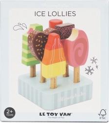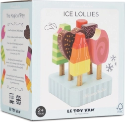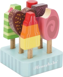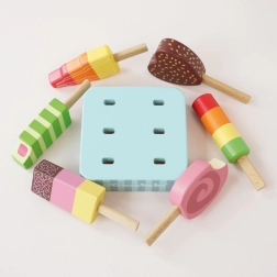 Dette legesyge sæt indeholder seks håndeftermalede ispinde med realistiske detaljer – i chokolade-, frugt- og flødevarianter – plus en solid træholder til servering og opbevaring. Den høje kvalitet i bæredygtigt FSC-træ og de glatte kanter sikrer sikker og langvarig leg.