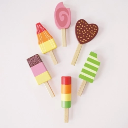 Seks unikt håndmalede træispinde med glade farver og former stimulerer fantasien og indbyder til endeløs rolleleg som is-sælger.