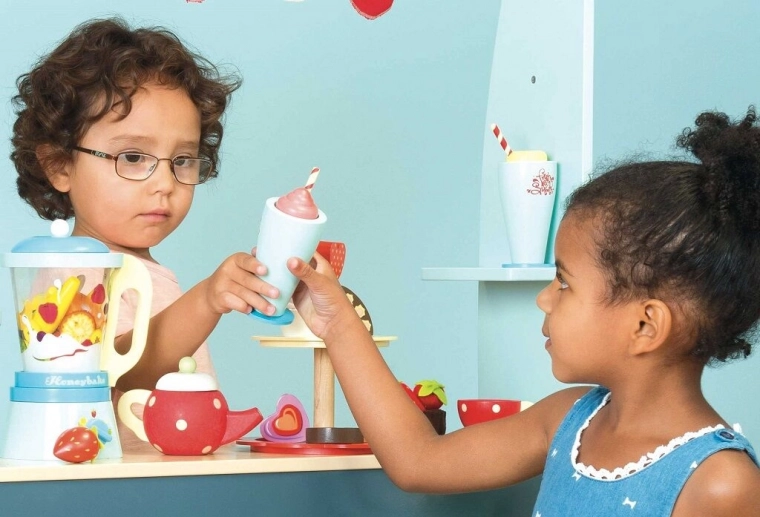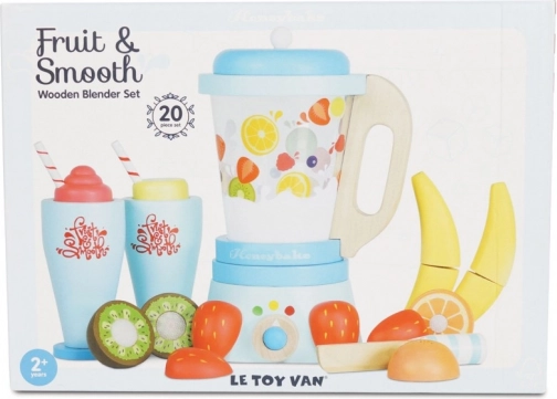 Dette stilfulde trælegesæt fra Honeybake-kollektionen forvandler ethvert legekøkken til en smoothiebar. Børn kan sikkert “skære” frugt med velcro, fylde blenderkanden og servere lækre drikke i to bægre med sugerør. Realistiske detaljer understøtter rolleleg, udvikling af finmotorik og kognitive færdigheder.