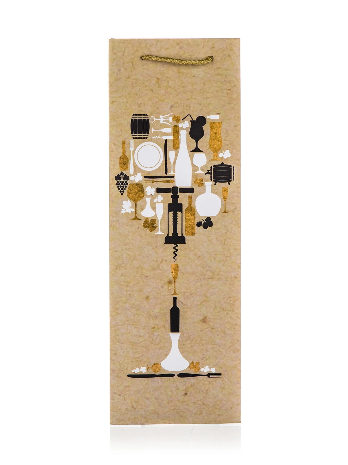 Denne gavepose til flaske er et fremragende valg til fødselsdage, bryllupper, firmagaver og højtider. Kvalitetspapir og et solidt tekstilhank sikrer pålidelig transport af en vin- eller spiritusflaske, mens dekoren med glas-motiv giver gaven et elegant udseende.