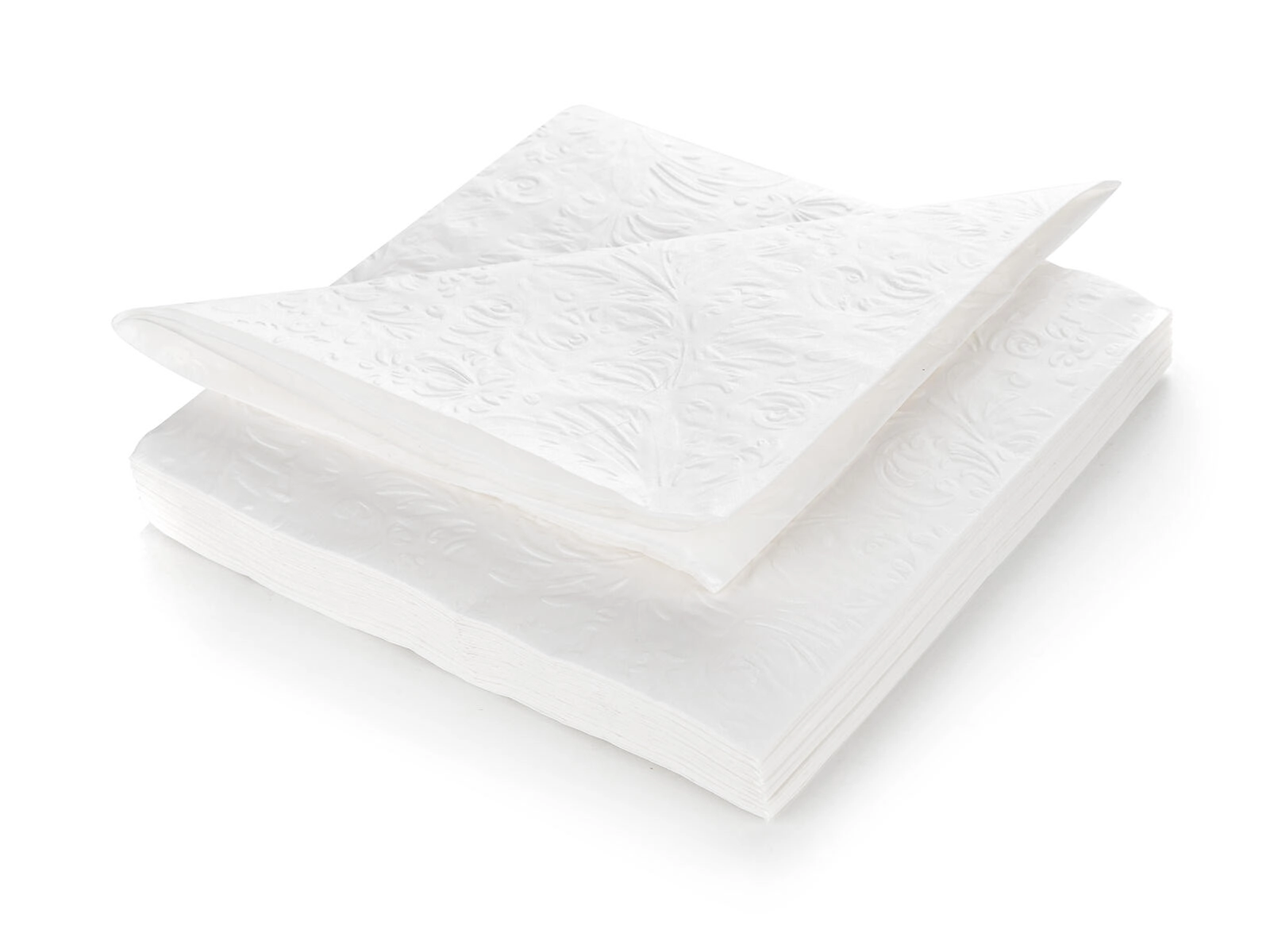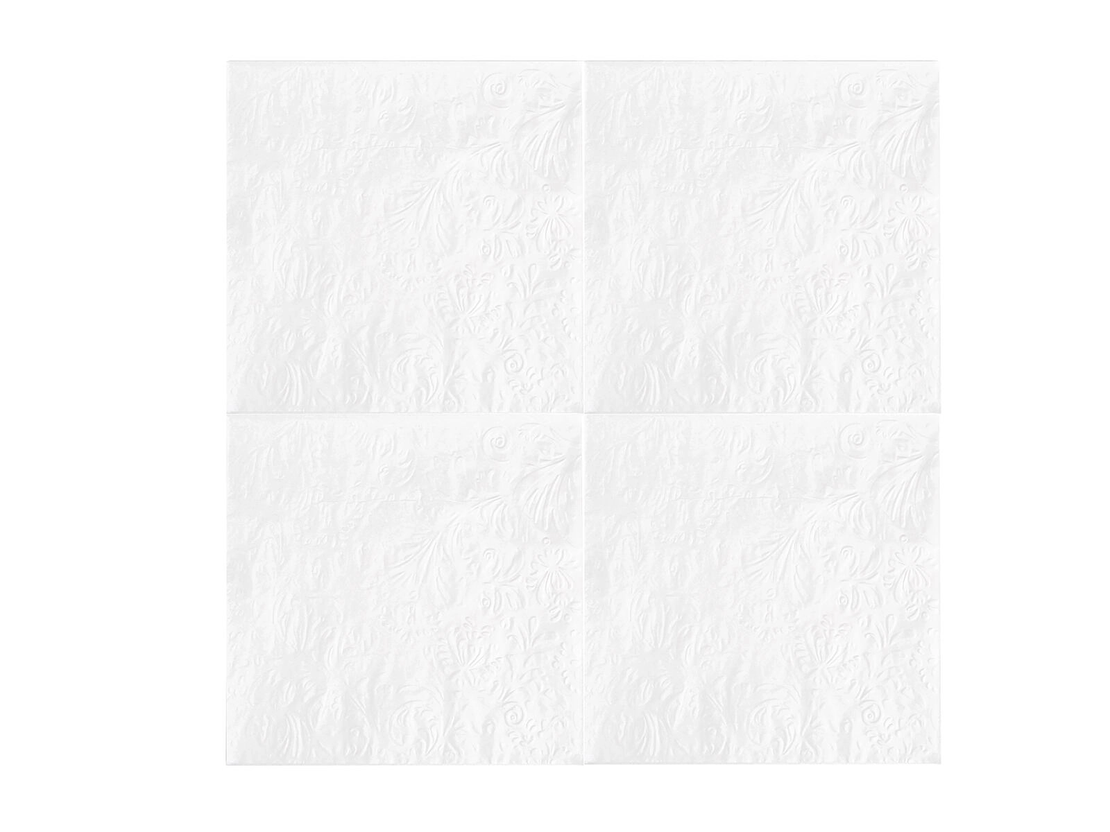 Disse hvide servietter med et diskret præg er ideelle til festborde, familiefester og daglig borddækning. Takket være tre lag er de behageligt bløde, samtidig robuste og meget absorberende. Den universelle størrelse 33 × 33 cm giver komfort i hjemmet, i skolen og på farten.