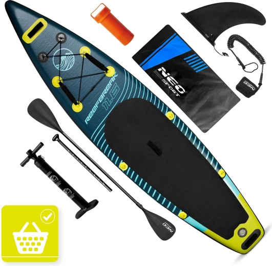 Oplev et stabilt og holdbart oppusteligt paddleboard Reefbreak 11'6, der leverer uforglemmelige oplevelser på vandet. I den komplette pakke finder du et justerbart paddel, en dobbeltvirkende pumpe med manometer, leash, finne, reparationssæt og en robust transportrygsæk. Takket være den skridsikre EVA-måtte, tre stabiliserende finner og høj bæreevne op til 150 kg er den ideel til roligt vand og mindre bølger.