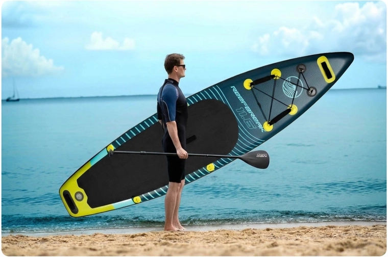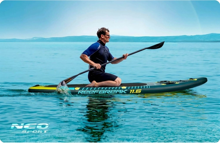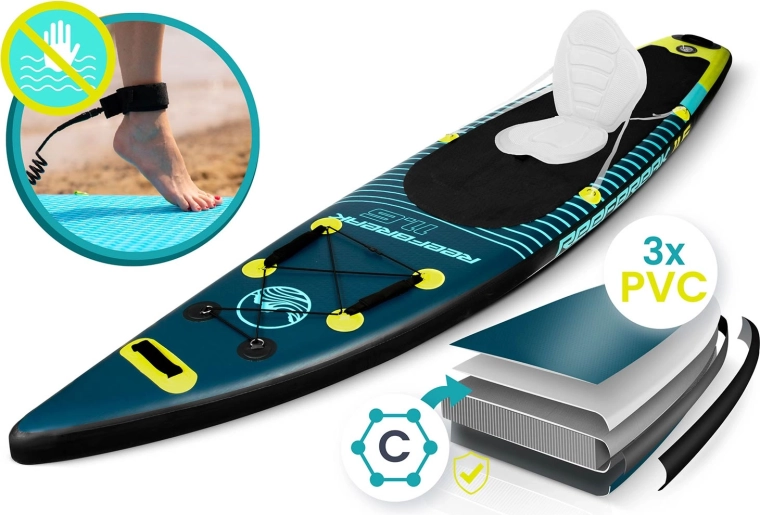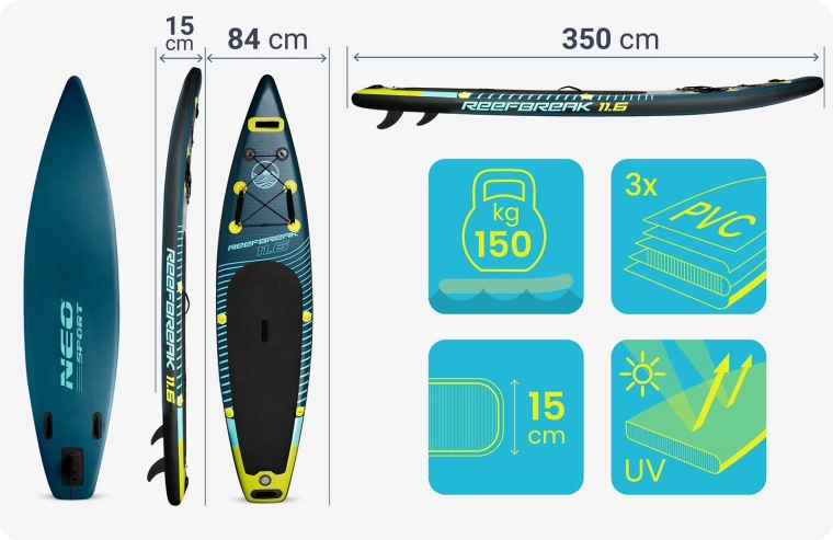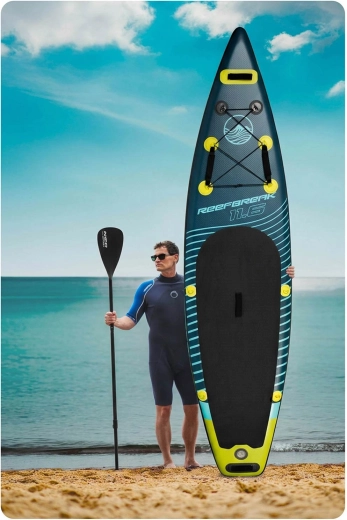 REEFBREAK 11'6 kombinerer tryghed og komfort med en let og adræt konstruktion. Trelags PVC med Drop Stitch Light-teknologi og forstærkede sider giver fremragende stivhed, lang levetid og UV-modstand. Den skridsikre EVA-deckmåtte giver sikkert fodfæste selv med våde fødder, mens 3 finner leverer retningsstabilitet og nem manøvrering.