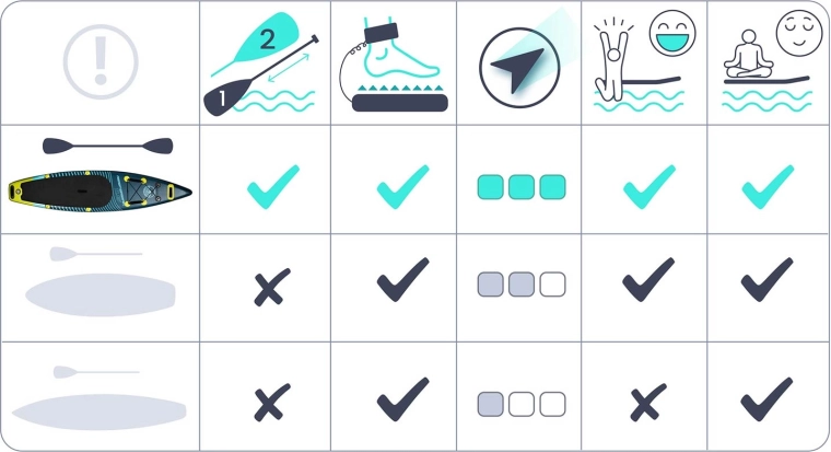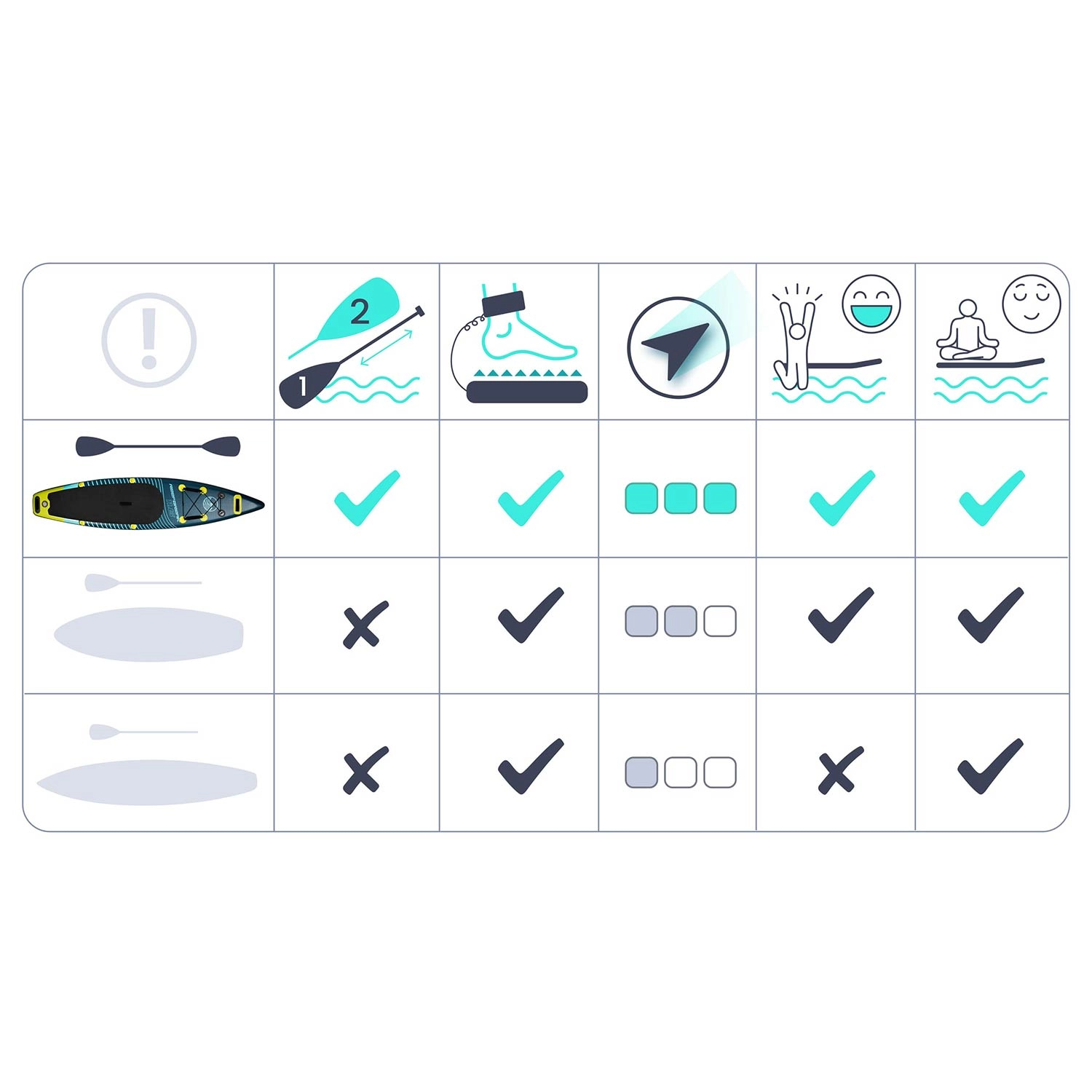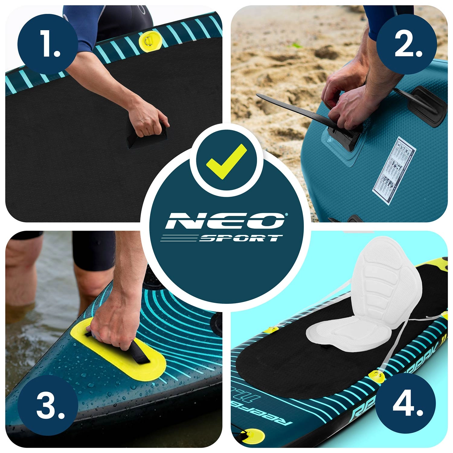 Alt, hvad du behøver, i én pakke: justerbart paddel, dobbeltvirkende pumpe med manometer, sikkerhedsleash, finne, reparationssæt og robust rygsæk til nem transport.
