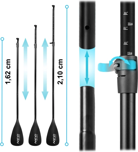 I det forreste elastiske lasternet kan du nemt fastgøre rygsæk, jakke eller drikkeflaske. Det justerbare aluminiums-paddel (162–210 cm) låses hurtigt med et låsehåndtag og tilpasses forskellige højder og padlestile. Den dobbeltvirkende pumpe med manometer gør oppumpning hurtigere, og trykkontrollen er altid lige ved hånden. Leash med drejeled filtrer ikke sammen og holder dig sikker. Hele sættet kan nemt pakkes i den robuste transportrygsæk for bekvem rejse.