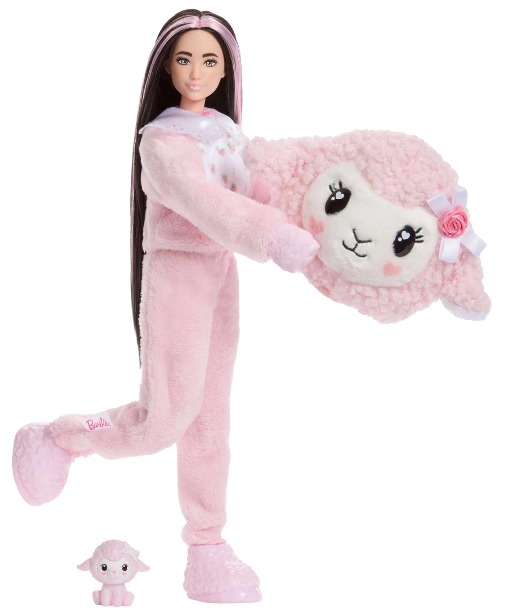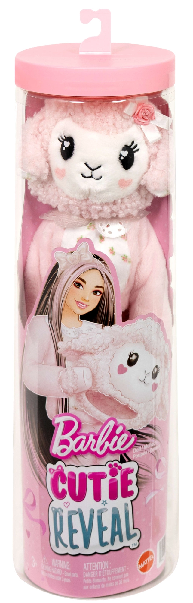 Træd ind i en verden af overraskelser og nuttet stil. Dukken er gemt i et blødt kostume af en lyserød lam med sløjfemønster. Når du afslører den, finder du en BARBIE-dukke med langt hår, klar til at blive friseret og klædt på. Dragten kan vendes og forvandles til en moderigtig jakke, og kostumehovedet fungerer som et rede til mini-kæledyret.