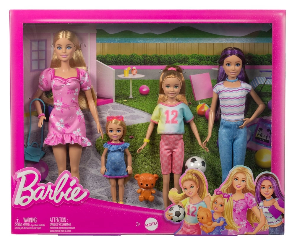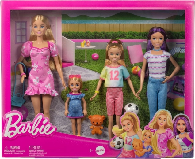 Dette farverige familiesæt bringer fire forskellige figurer med deres unikke udseende og interesser: elegante Barbie i lyserød kjole, teknologinysgerrige Skipper med tablet, sportige Stacie med fodbold og søde Chelsea med plysbamse. Hver dukke har aftageligt tøj og detaljer, der understøtter realistisk leg.