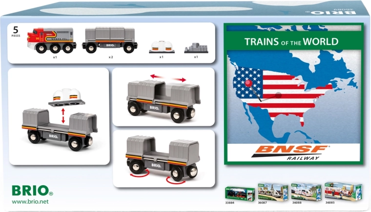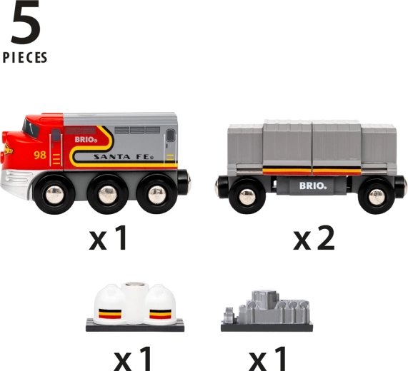 Sættet indeholder 1× trælokomotiv, 2× godsvogn og 2 ekstra laster (vand og sølvfarvet motorvægt). Takket være de kompakte mål passer det perfekt til de fleste trætogbaner og understøtter udvikling af fantasi, finmotorik og legefærdigheder.