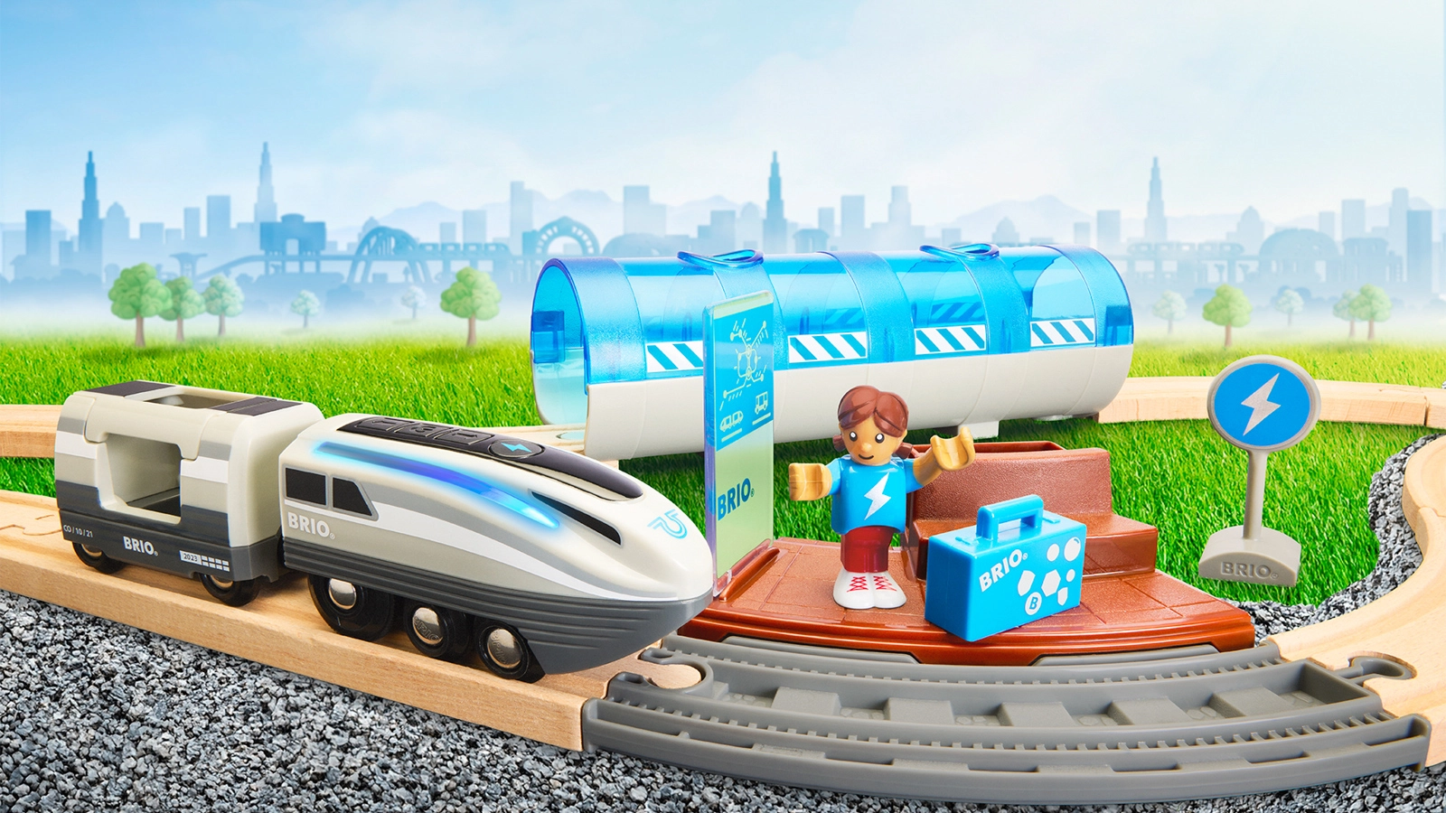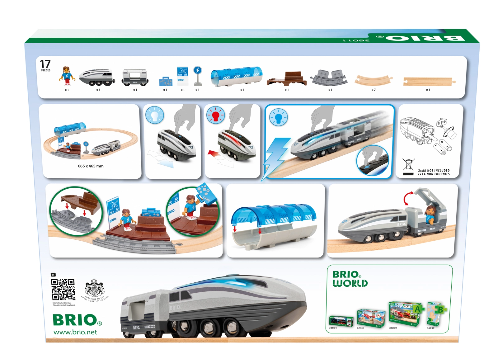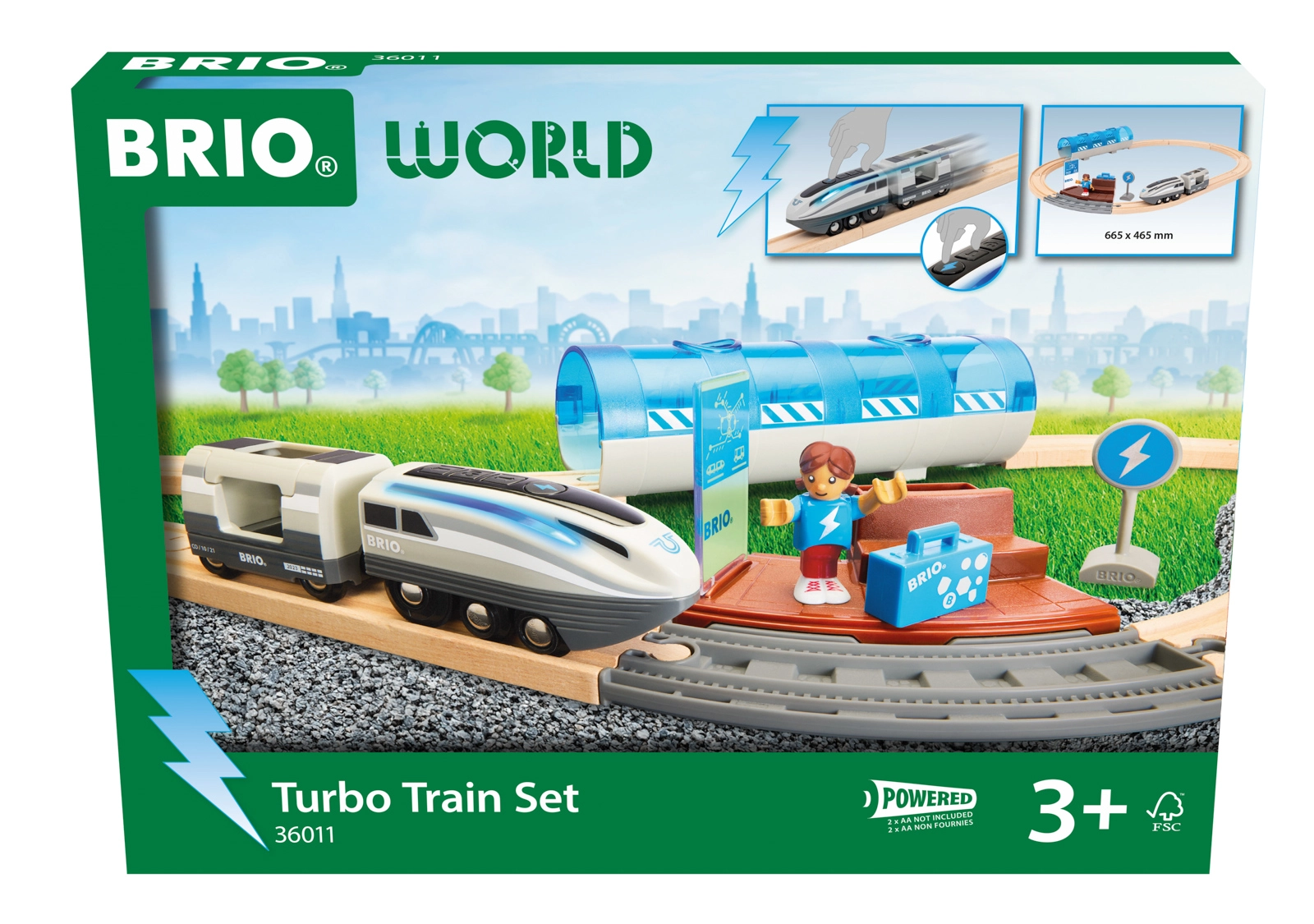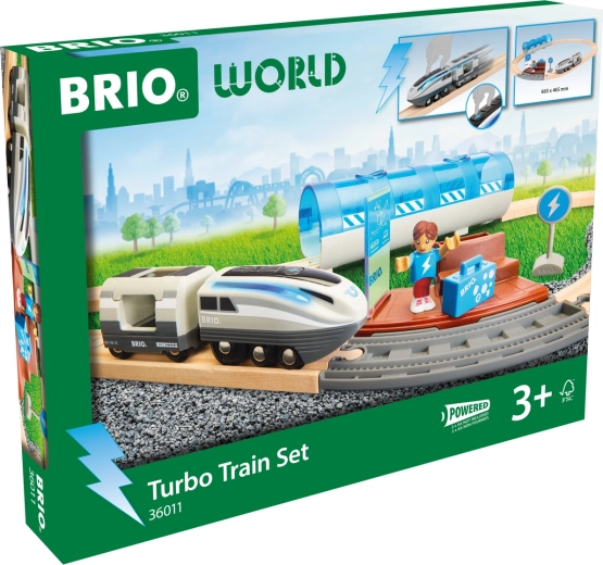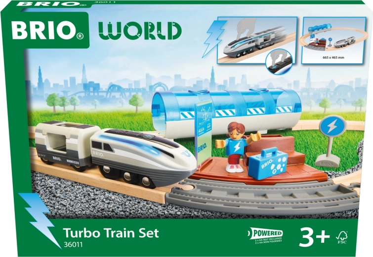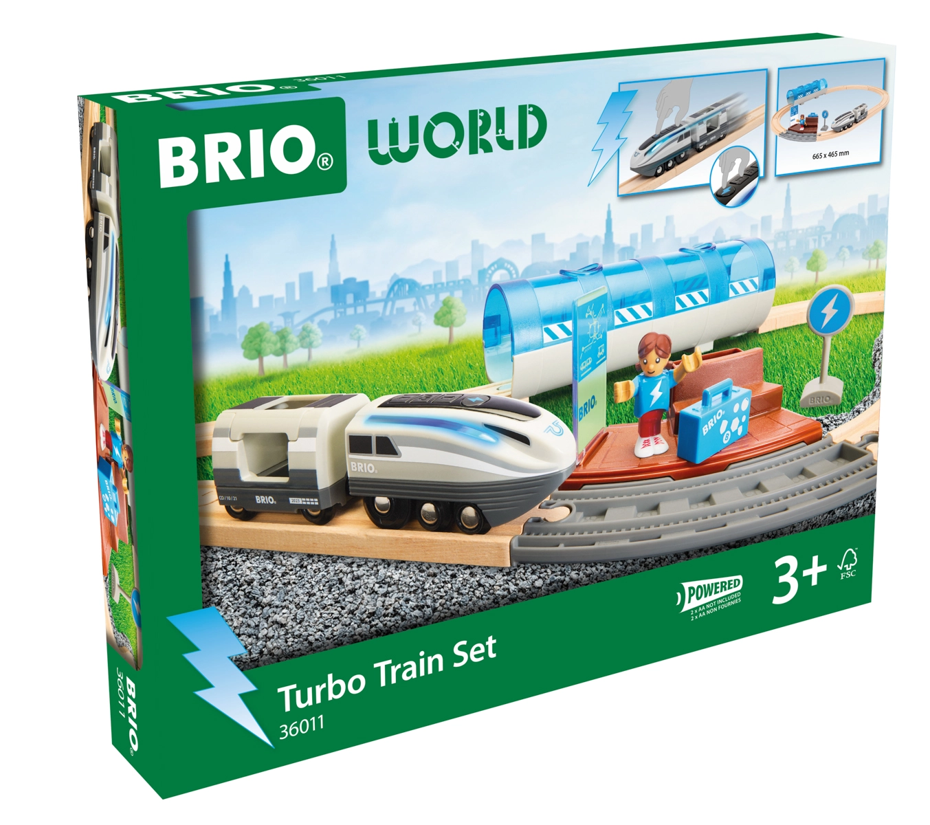 Dette kreative togsæt giver børn dynamisk leg: med et tryk på Turbo-knappen forvandles det batteridrevne lokomotiv i 5 sekunder til det hurtigste tog i BRIO-verdenen, og dets sidelamper skifter fra hvid til kølig blå. Byg banen, kør gennem tunnelen, stop ved perronen, og fortæl dine egne historier med passagerer og tilbehør.
