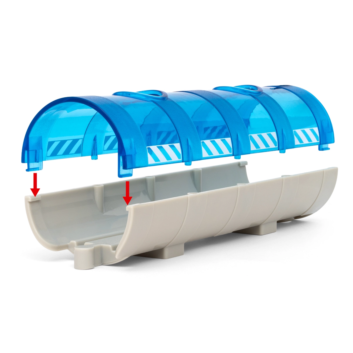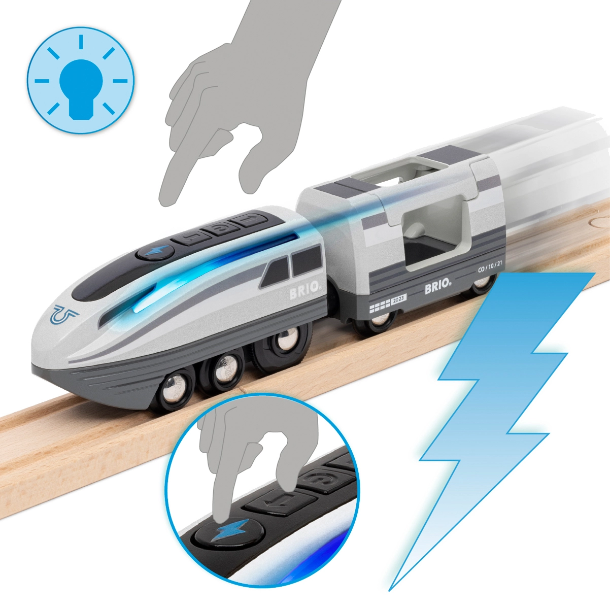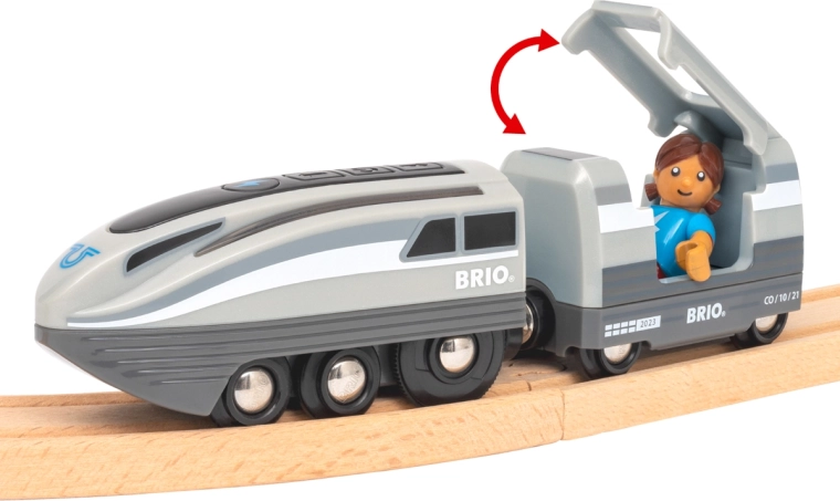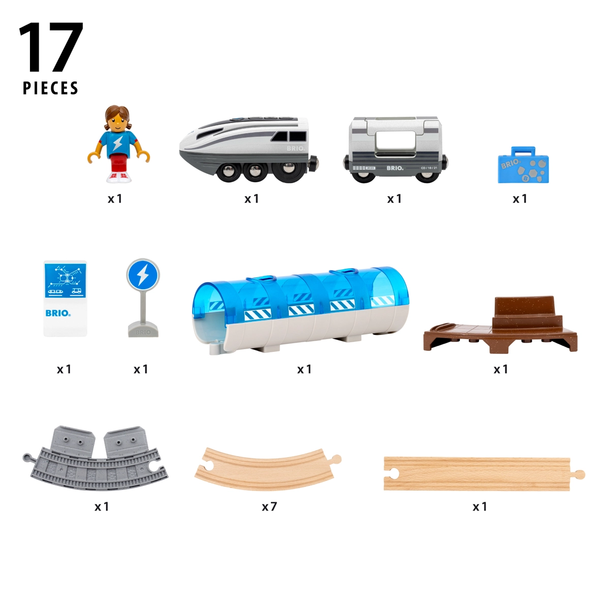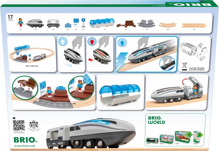 Dette kreative togsæt giver børn dynamisk leg: med et tryk på Turbo-knappen forvandles det batteridrevne lokomotiv i 5 sekunder til det hurtigste tog i BRIO-verdenen, og dets sidelamper skifter fra hvid til kølig blå. Byg banen, kør gennem tunnelen, stop ved perronen, og fortæl dine egne historier med passagerer og tilbehør.