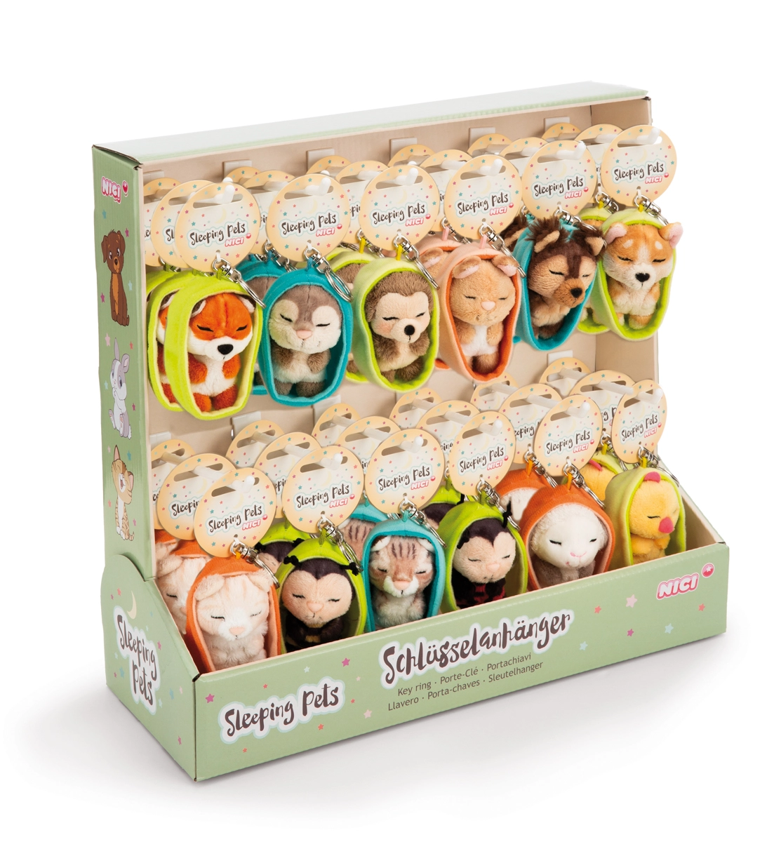 Opdag de søde NICI-nøgleringe fra Sleeping Pets-kollektionen i et fuldt displayer – i alt 36 stk. bløde plysdyr på 12 cm. Hver nøglering har en stærk metalring til fastgørelse på nøgler, rygsæk eller pung og tilhører den bæredygtige serie NICI GREEN af genanvendte materialer (RPET). Assortimentet er en tilfældig blanding af modeller – valg kan ikke påvirkes.