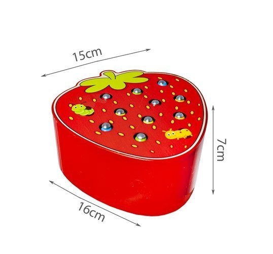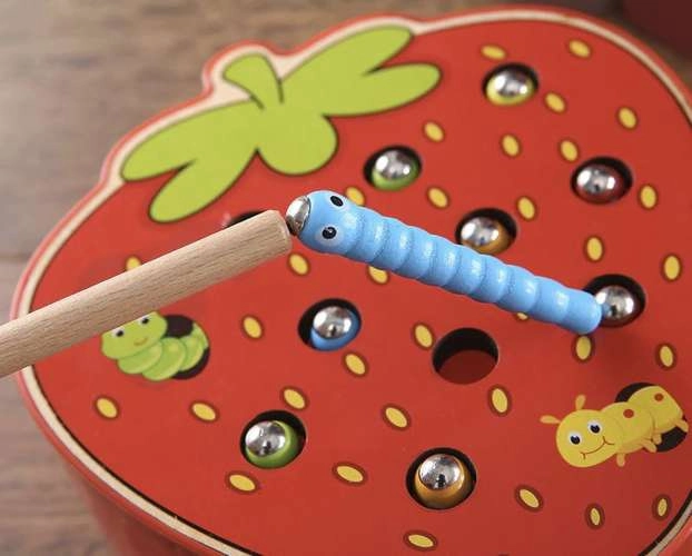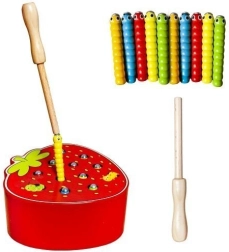 Et sjovt træspil formet som en lækker jordbær, der udvikler finmotorik og koncentration. Børn bruger en magnetisk pind til at trække orme op af hullerne og sætte dem i igen. Spillet er lavet af sikre materialer og har livlige farver, som motiverer børn til leg og læring. Et godt valg til udvikling af hånd-øje-koordination, kreativitet og tålmodighed.