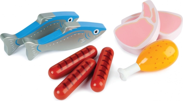 Frisk levering af kød og fisk i en træboks med håndtag. En fantastisk legetøj til købmands- eller kokkeleg; sættet indeholder 2 fisk, 2 koteletter, 3 pølser og 1 kyllingelår. En glimrende måde at lære børn vigtigheden af en sund og afbalanceret kost, hvor maden kommer fra, og hvordan man tilbereder den. Hver del er robust og ideel til små børnehænder. Understøtter kreativ og fantasifuld leg. Fremstillet af kvalitetsmaterialer fra ansvarlige kilder. Overholder europæiske sikkerhedsstandarder. Hovedegenskaber: ideel form til små børnehænder, understøtter kreativitet og fantasi