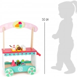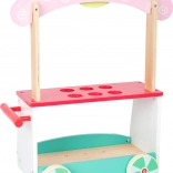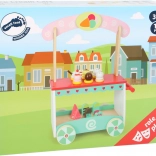 Denne detaljerede træ isvogn forvandler ethvert værelse til et legende konditorhjørne. Med fire hjul og et komfortabelt håndtag kan de små sælgere køre ud til kunderne hvor som helst. Den øverste plade har forberedte pladser til alle lækkerierne, og den nederste hylde giver ekstra plads til opbevaring af legetøj eller tilbehør.