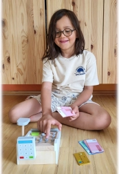 Dette holdbare kasseapparat i minimalistisk design passer perfekt på børneværelset og i legerummet. Børn kan indtaste priser på tastaturet, betale med sedler eller kort og øve grundlæggende regneoperationer.