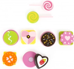 Oplev magien ved sød leg med det farverige sæt af trædelikatesser SMALL FOOT. Slikkepinde, småkager og praliner er lavet af 100% certificeret FSC-træ, og med de robuste velcrolukninger kan børnene dele og sætte dem sammen igen og igen. Realistiske tilbehør forvandler ethvert børnekøkken til et kreativt konditori.