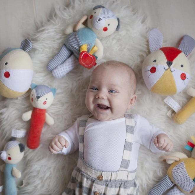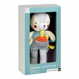Den bæredygtige produktion understøttes af GOTS-økologisk bomuld, genanvendte materialer og ugiftige farver. Legetøjet er let, nemt at holde og sikkert for babyer 0+, ideelt til barnevogn, tremmeseng og derhjemme.