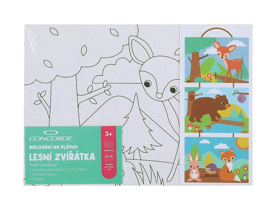 Oplev kreativ sjov med malersættet CONCORDE med motiver af skovdyr. Sættet indeholder 3 ophængelige lærreder 12,7 × 17,8 cm, 6 kopper med maling og en pensel – ideelt til børn og begyndere. Mal efter skabelon, eller brug fantasien og skab originale billeder fulde af farver. Skaberi giver glæde, afslapning og udvikler kreative evner.