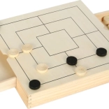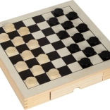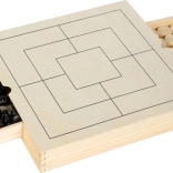 Dette elegante træsæt tilbyder tre klassiske strategispil i ét: skak, dam og mølle. Med de kompakte mål 28 × 28 × 4 cm og integrerede skuffer er det ideelt både på farten og derhjemme. Hver del har sin plads, så intet går tabt, og spillet kan begynde på få sekunder.
