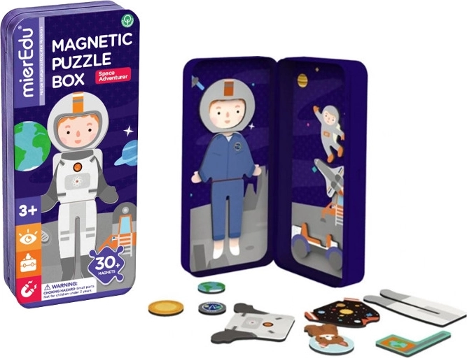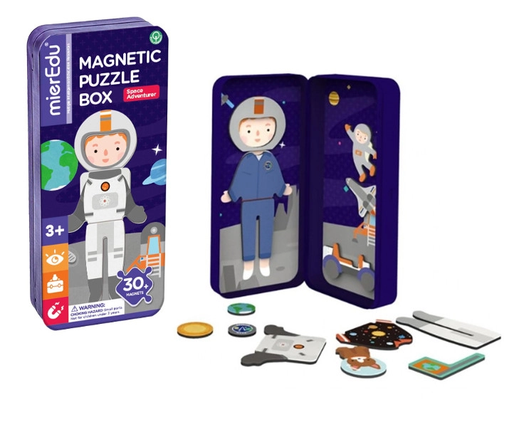 Det rejsevenlige magnetiske puslespil Rumforskere forvandler enhver tur til en legende ekspedition. Den farverige foldeæske bliver ved åbning til en dobbeltsidet spilleflade med to forskellige scener, der stimulerer fantasien og indbyder til konstant opfindelse af nye historier.