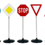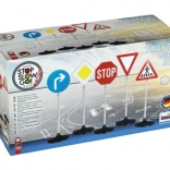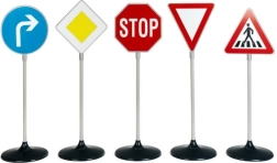 Sæt med fem af de mest anvendte skilte (f.eks. STOP, Ubetinget vigepligt, Hovedvej, Påbudt retning, Fodgængerfelt) hjælper børn med hurtigt at tilegne sig de grundlæggende regler.