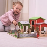Sættet er fremstillet af kvalitetstræ fra ansvarlige kilder og er kompatibelt med ekstra tilbehør, som kan tilkøbes. Realistiske elementer som lille andedam, garage til traktor og indhegninger med bevægelige porte fremmer fantasifuld leg, historiefortælling og udvikling af finmotorikken.