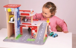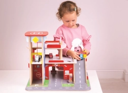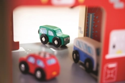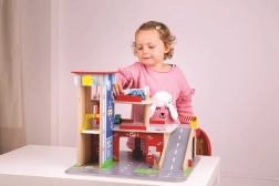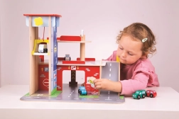 Børn vil elske sjov leg på hver af de tre etager i garagen med parkeringsplads. I stueetagen kan de køre bilen ind i den fungerende elevator og derefter køre op til anden sal og parkere. I stueetagen finder børnene et værksted, en vaskehal og en tankstation. Fra første sal kan bilerne køre af sted ved hjælp af elevatoren eller via rampen – men pas på, bilerne skal vente, til bommen er løftet! Det højeste punkt på garagen er en helikopterlandingsplads. Denne garage har simpelthen alt, hvad en lille chauffør behøver for at komme fra A til B. Understøtter kreativitet og fantasi. Udvikler hånd-øje-koordination, finmotorik og fingerfærdighed. Kan suppleres med biler fra Bigjigs Toys og Bigjigs Rail. Fremstillet af kvalitetsmaterialer fra ansvarlige kilder. Vigtigste egenskaber: 3 etager med parkeringsplads og helipad, fungerende elevator, værksted, vaskehal og tankstation i stueetagen.