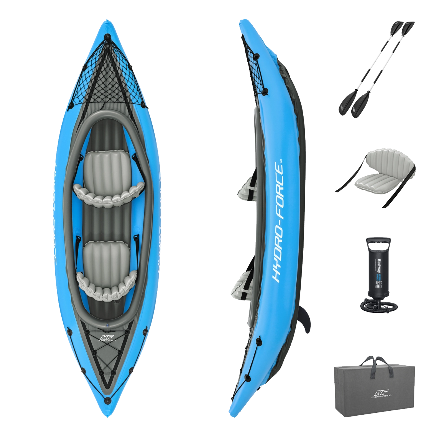 I pakken får du en 2-personers kajak, to dobbeltsidede pagajer, Air Hammer håndpumpe, aftagelig finne/skeg, reparationslap og transporttaske – klar til afgang med det samme.