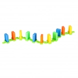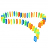 Pakkens indhold: 126× dominobrikker (4 farver), 2× fly med affyrer, baneelementer, 2× kugle, 1× figur, 12× base til domino, 52× læringsklistermærker (bogstaver, tal, matematiske tegn).