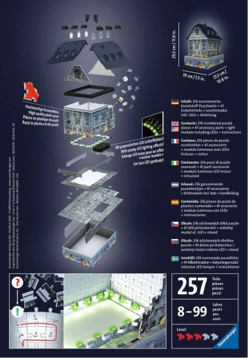 Oplev spændende underholdning med 3D-puslespillet Ravensburger Spøgelseshus. 216 solide brikker danner efter samling en stabil model, der lyser i mørke og giver timevis af sjov og logisk træning for børn fra 8 år og voksne.