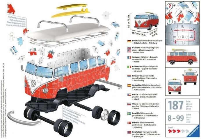 3D-puslespillet styrker koncentration og finmotorik og byder samtidig på en underholdende måde at lære det ikoniske design af den klassiske “bus” at kende. Samlingen er intuitiv og giver et tilfredsstillende resultat, som vil glæde enhver elsker af biler og puslespil.