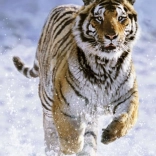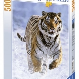 Puslespillet viser et smukt billede af en tiger i bevægelse på sneen, der fanger med sine kontrastfyldte farver.