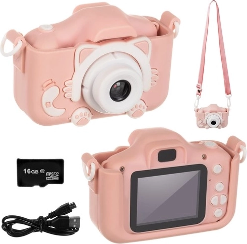 Kruzzel børnekamera fremmer kreativitet og sjov – tager fotos og videoer i Full HD med lyd, tilbyder filtre og rammer, serieoptagelse og nem betjening for børn fra 3 år. Sættet inkluderer et 16 GB-kort og et beskyttende silikonecover formet som en kat for sikker brug.