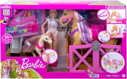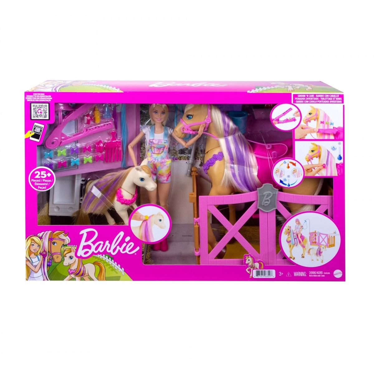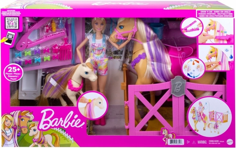 Sættet BARBIE Heste – Styling og pleje leverer en komplet stald med bruser, vandtrug og område til børstning. Begge heste har fyldige maner med speciel farveskiftende effekt – koldt vand afslører farvede striber, varmt vand skifter dem tilbage. Takket være de mange tilbehør skaber du nemt smukke frisurer til både heste og dukke.