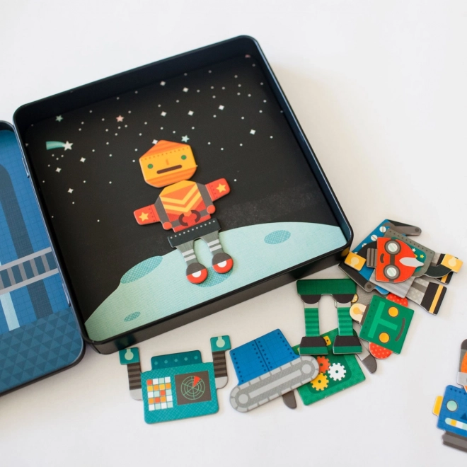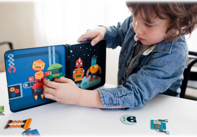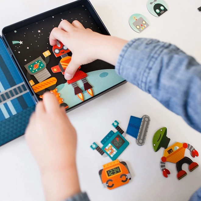 Opdag den kreative verden med det magnetiske spil robotter fra PETIT COLLAGE. I den praktiske metaldåse finder du over 25 magnetiske dele til at sammensætte forskellige robotfigurer. Det kompakte sæt med to scener indeni er ideelt til rejser og styrker både fantasi og finmotorik. Fremstillet med fokus på sikkerhed – giftfri farver og overholdelse af sikkerhedsstandarder.