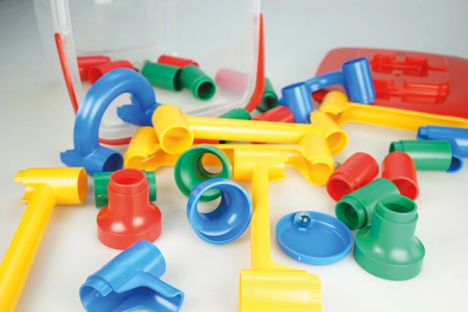 Opdag det kreative byggesæt Cascade i en praktisk spand med hank. Børn kan bygge deres egne baner og derefter sende en kugle afsted, som bevæger sig gennem flere niveauer. Legetøjet udvikler finmotorik, logisk tænkning og kreativitet – ideel underholdning for små konstruktører.