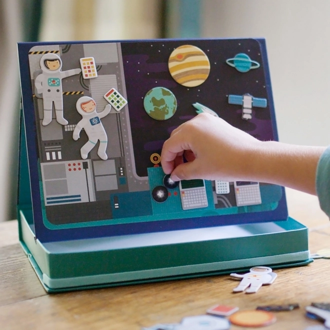 Det magnetiske rumteater giver børn uendelige kombinationer og scener på to magnetiske baggrunde – i rummet og på rumstationen. Med mere end 50 magnetiske dele kan små opdagelsesrejsende skabe originale fortællinger, udvikle fantasi og finmotorik. Den praktiske æske med stander og stopklodser gør det nemt at opstille scenen hvor som helst.