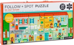 Dette kreative sæt fra PETIT COLLAGE kombinerer puslespil og interaktiv labyrint i ét spil, der både underholder og lærer børn noget. Når de 10 store brikker er lagt, dannes et langt billede af et hus (53 × 21,5 cm), hvor børnene følger den markerede rute med fingeren og samtidig opdager 20 skjulte genstande.
