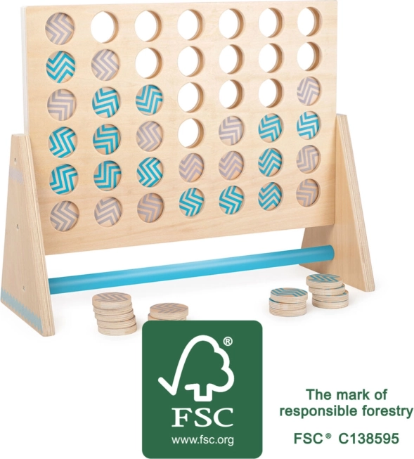 Oplev glæden ved det klassiske spil "Fire på Stribe" i XXL-udgave, fremstillet af 100% FSC-certificeret træ. Denne familieaktivitet styrker koncentration og logisk tænkning.